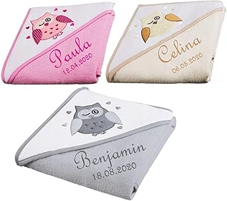 Maxi Baby Kapuzentuch mit Namen bestickt Eule grau rosa beige Kapuzenhandtuch Handtuch Kinder (beige)