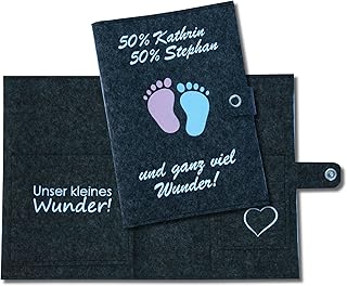 Mutterpasshülle Deluxe „50% Kathrin 50% Stephan“ mit Namen der werdenden Eltern - extra Fächer sowie Verschluss - Anthrazit - 100% Wollfilz- deutsche Handarbeit - passend für den deutschen Mutterpass!