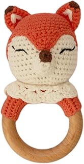 Baby Beißring gehäkelt Fuchs mit integrierter Rassel, Greifling – Babyspielzeug aus Holz mit gehäkeltem Stofftier – Geschenk zur Geburt, Babyparty