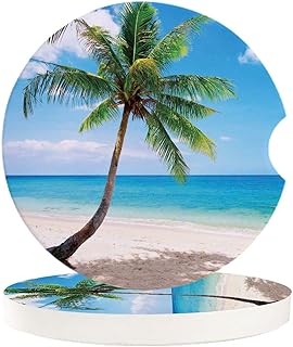 Auto-Getränkeuntersetzer Set von 4 Stück Kokospalme Sandstrand Hawaii saugfähige Keramik Stein blau gelb Untersetzer mit einer Fingerkerbe für einfaches Entfernen vom Auto Becherhalter