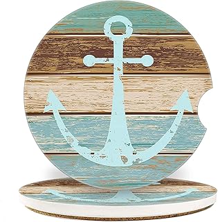 Saugfähige Auto-Untersetzer für Getränke, 2 Stück, rund, Keramik-Steinuntersetzer mit Fingerkerbe für einfaches Entfernen, Korkboden, Auto-Innendekoration, 6,5 cm, nautischer Anker, Retro-Stil