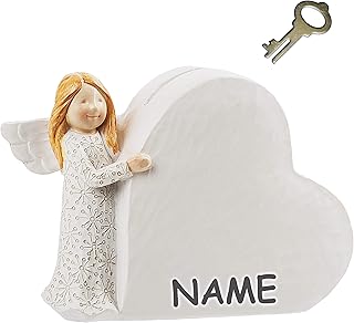 alles-meine.de GmbH große Spardose - Engel / Schutzengel mit Herz - inkl. Name - mit Schlüssel und Schloss - stabile Sparbüchse - aus Stein Kunstharz / Polyresin - Verschluss - S..